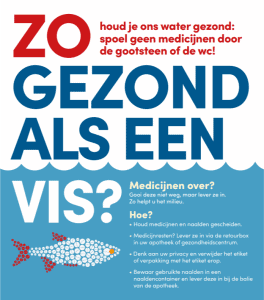 Volgens de Rijksoverheid komt jaarlijks minstens 140.000 kilo medicijnresten via het riool in het oppervlaktewater, zoals rivieren en plassen, terecht. Dit komt onder meer omdat wij medicijnresten (capsules, pillen, dranken) door het toilet en/of de gootsteen spoelen. Deze medicijnresten hebben invloed op het leven van planten en vissen in het water en dat willen wij natuurlijk niet!